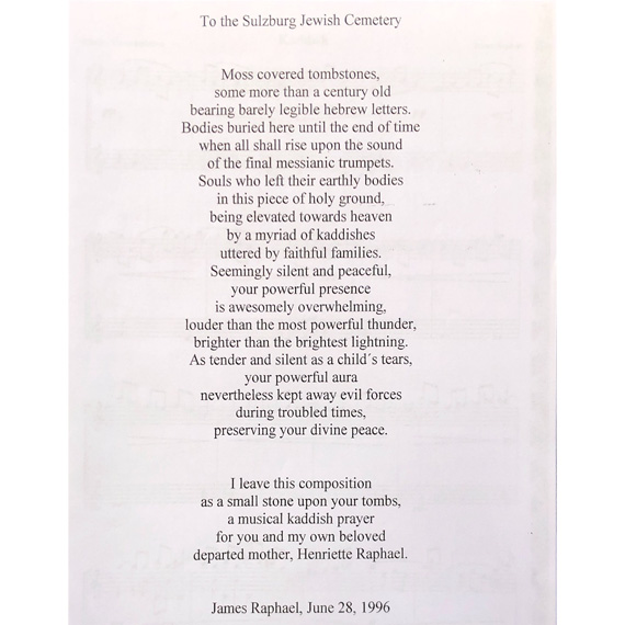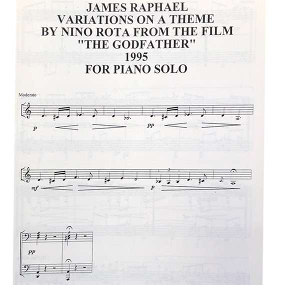 13 variations and Grand 5 voice fugue on the Hatikva meaning hope which is the National Anthem of Israel dedicated to the victims of the Holocaust which included my grandmother Julia Nachmias , my uncle Victor and my aunt Beatrice who were both young children at the time and were taken from Salonica , Greece to Auschwitz where they were killed along with their mother by the Nazis . The sheet music of this piano composition by James Moussaieff Raphael which is a world renowned masterpiece will be personally signed by the composer.